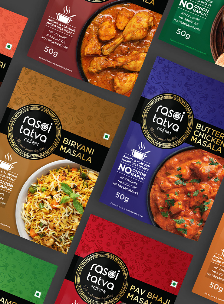 With a rich legacy dating back to 1905 and a global presence, Rasoi Tatva is making waves in the Indian FMCG industry with over 15+ high-quality products. Tasked with appealing to their target audience, we designed a range of spice blends, considering key elements like brand identity and visual appeal. Our packaging design, boasting vibrant colors and captivating photographs, stands out in the crowded spice market, communicating the brand’s commitment to quality. The result? Wider distribution, availability in 1000+ stores, and a positive impact on brand perception, contributing to Rasoi Tatva’s market growth.